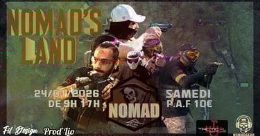 Nous vous accueillons sur notre terrain Nomad's Land, un terrain assez polyvalent puisqu'il possède à la fois des zones de jeux rapprochées et dynamiques mais aussi des zones avec des distances plus lointaines, de quoi satisfaire les goûts de chacun(e)s ! Nous mettons à votre disposition une zone neutre intérieure (places limitées) propre, avec chaises et tables et disposant de l'électricité. Lors de la pause repas un barbecue ainsi qu'un micro-onde sera à disposition de tous. Des boissons fraiches sont également disponibles à la vente durant la journée.